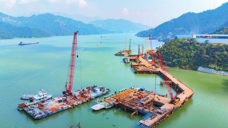 11月4日,三峡枢纽江南成品油翻坝项目坝上码头施工现场机械轰鸣,一片繁忙景象。由宜昌三峡枢纽江南翻坝成品油投资运营有限公司投资、中交二航局承建的三峡枢纽江南成品油翻坝项目,建设内容包含5个5000吨级油品泊位及相应配套设施。目前,项目钢栈桥及钻孔平台已完工,正在开展靠船墩栽桩孔及管廊区域主体桩基施工,整体施工进度完成20%,项目预计2027年8月份完工。(记者胡兴军、通讯员彭强 摄)